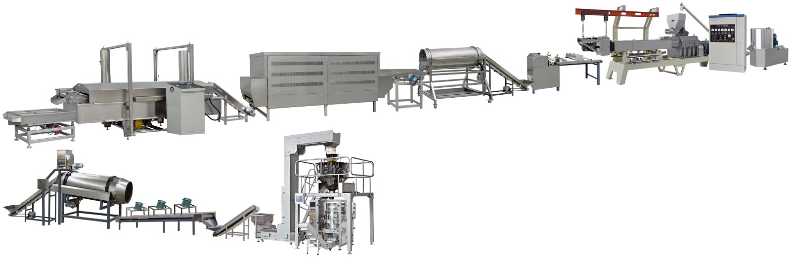 特点:三角片多力多滋生产线、多力多滋成型设备当把粮食置于膨化器以后,随着加温、加压的进行,粮粒中的水分呈过热状态,粮粒本身变得柔软,当到达一定高压而启开膨化器盖时,高压迅速变成常压,这时粮粒内呈过热状态的水分便一下子在瞬间汽化而发生强烈爆炸,水分子可膨胀约2000倍,巨大的膨胀压力不仅破坏了粮粒的外部形态,而且也拉断了粮粒内在的分子结构,将不溶性长链淀粉切短成水溶性短链淀粉、糊精和糖,于是膨化食品中的不溶性物质减少了,水溶性物质增多了。