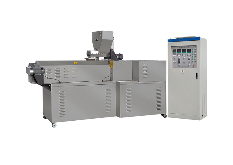 双螺杆膨化挤压机由供料系统、挤压系统、加热系统、传动系统、旋切系统和控制系统等几部分组成。将物料由喂料机喂入,机筒经过高温、高压、高剪切,使物料膨化以达到所需的组织状态等品质要求。