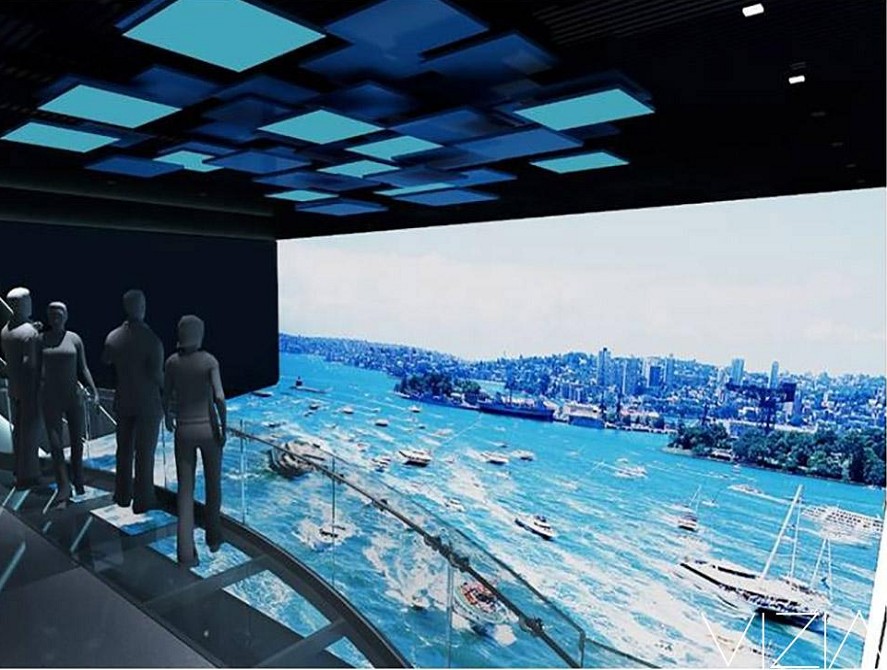 地幕为水平或呈一定倾斜,直幕垂直于地面,双幕之间通过圆弧形倒角进行连接过渡。参观者于地幕前,面向直幕进行观影体验。观众席距离地面设置一定距离,产生到居高临下的体验感受,呈现特别的沉浸式虚拟现实,即裸眼3D的即视效果,拥有独特的展示效果和最强大的震撼力。
