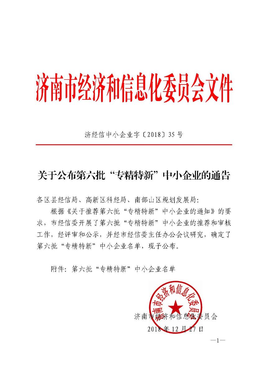 7、济南市经信委为进一步推动民营经济和中小企业高质量发展,提高企业专业化能力和水平,在全市范围内开展了”专精特新“中小企业认定工作。山东新普锐经过层层筛选,以自己独特的专业化、特色化,成功获批济南市第六批”专精特新“企业称号。该奖项充分肯定了山东新普锐良好的运营状况,体现了山东新普锐核心竞争力,为公司长远稳定发展树立了信心。